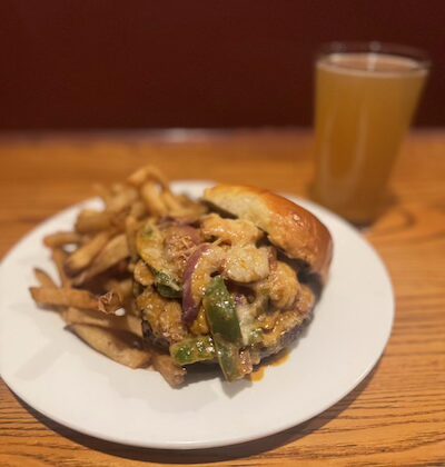 4 oz burger patty, chopped shrimp, andouille, peppers, onions, tomatoes with a creole sauce and parmesan cheese. Served with beach fries. $18