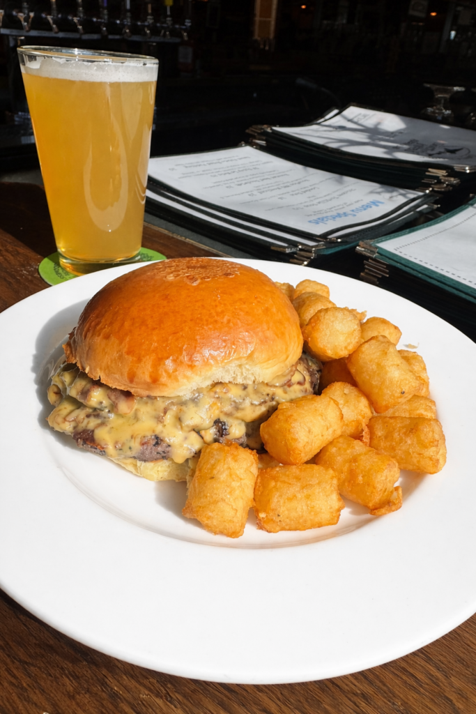 Two Smash burger patties, with white onions, fresh jalapenos, and a Grateful Dead beer and bacon cheese sauce. Served with a side of tater tots. $18