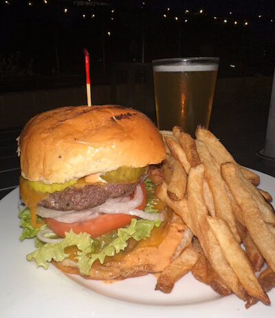 Two 4oz patties topped with cheddar, pickles, lettuce, tomato and onion with a sweet and spicy paradise sauce. Served with beach fries. $16
